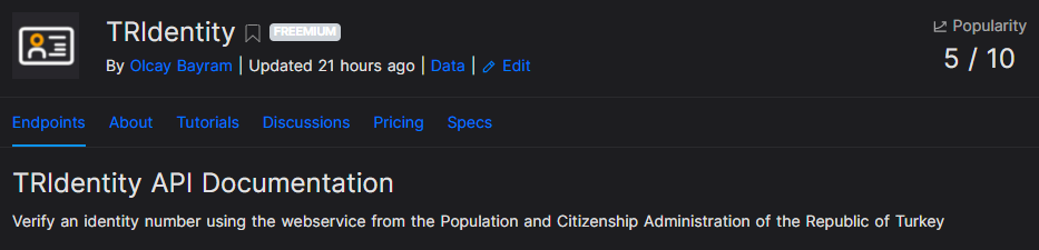 RapidAPI üzerinden ulaşabilir ve gerekli bilgileri edinebilirsiniz. Eğer kaynak koduna destekte bulunmak isterseniz https://github.com/olcay/tridentity reposuna beklerim. Fikir vermek adına yabancı kimlik doğrulama servisi eklenebilir.
